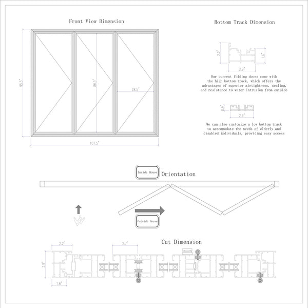 - Door Orientation: The door panels fold from Left to Right when viewed from the outside looking in. Please refer to the photo gallery and detailed drawing for reference.
