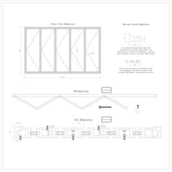- Door Orientation: The door panels fold from right to left when viewed from the outside looking in. Please refer to the photo gallery and detailed drawing for reference.