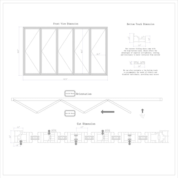 - Door Orientation: The door panels fold from right to left when viewed from the outside looking in. Please refer to the photo gallery and detailed drawing for reference.