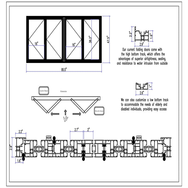 - Window Orientation: The panels fold from Dual Open when viewed from the outside looking in. Please refer to the photo gallery and detailed drawing for reference.