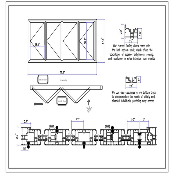 - Window Orientation: The panels fold from Right to Left when viewed from the outside looking in. Please refer to the photo gallery and detailed drawing for reference.